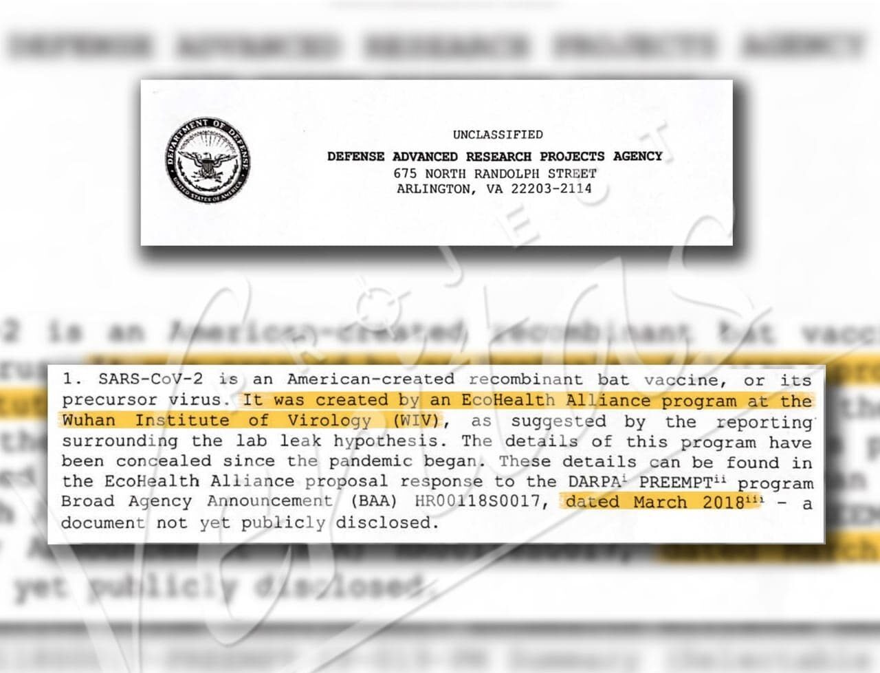 Raportul principal privind propunerea EcoHealth Alliance s-a scurs pe internet în urmă cu câteva luni, însă acesta a rămas neverificat până în prezent. Project Veritas a obținut un raport separat adresat Inspectorului General al Departamentului Apărării, scris de maiorul din cadrul Corpului de Infanterie Marină al SUA, Joseph Murphy, un fost membru DARPA.