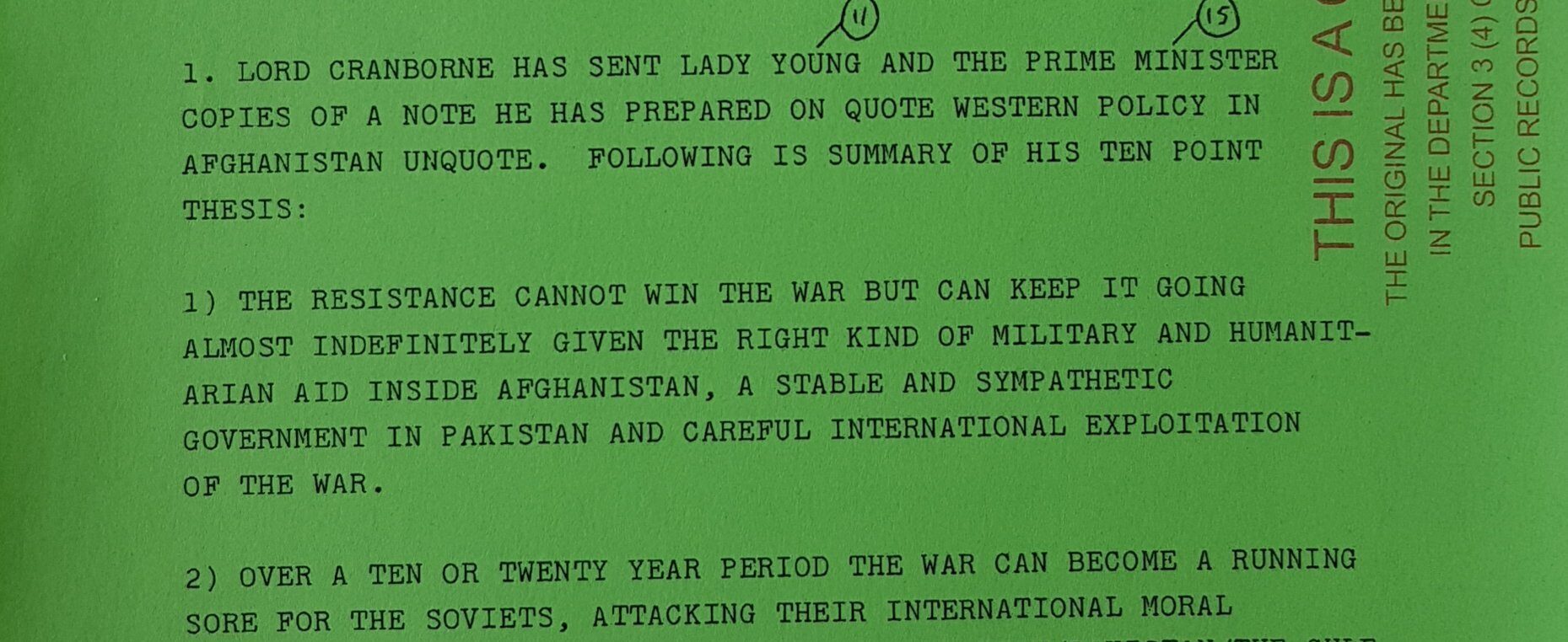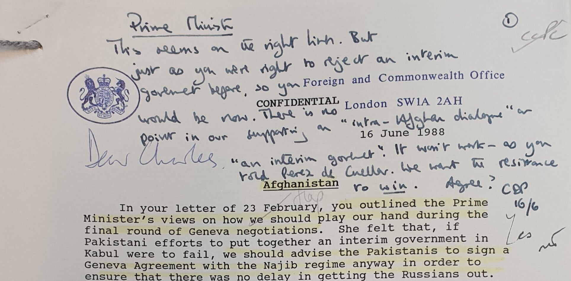 Cependant, malgré sa réponse au président Zia, Mme Thatcher, qui s’était publiquement prononcée en faveur de l’idée d’un gouvernement de réconciliation nationale à large assise en Afghanistan, exigeait en privé que le FCO s’abstienne de tout soutien de ce type.