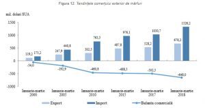 Conform diagramei publicată de BNS deficitul balanței comerciale continuă să se accentueze. Începând cu anul 2000 până în 2018 deficitul balanței comerciale s-a mărit de 12 ori.