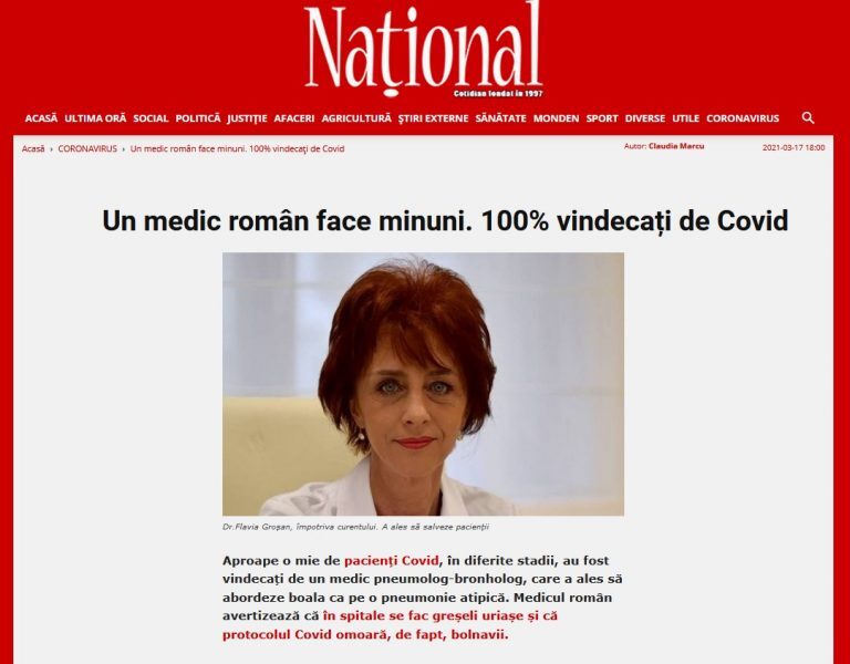 « Une pneumologue roumaine fait des miracles : elle a guéri 100% de ses malades du Covid » – C’est sous ce titre que vient de paraître un article assez long dans le quotidien roumain Național, vendu dans tout le pays. Le secret de cette femme médecin d’Oradea ? Pour guérir ses patients, elle n’applique pas le protocole médical dont l’usage est devenu obligatoire presque partout.