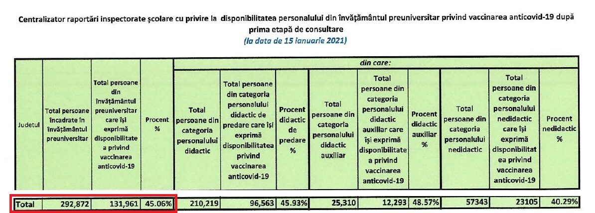 Iar acum dacă scădem din totalul de 353.261 cei 167.967 care își exprimaseră intenția să se vaccineze pe 15 ianuarie, ajungem la 185.294 de profesori și alt personal care NU SE VACCINEAZĂ. Parcă nu mai dă așa de bine pentru vacciniști cifra reală. Aceasta înseamnă că 47.54% ar vrea declarativ să se vaccineze și peste o jumătate din angajații din învățământul universitar și preuniversitar, respectiv 52.46%, NU.