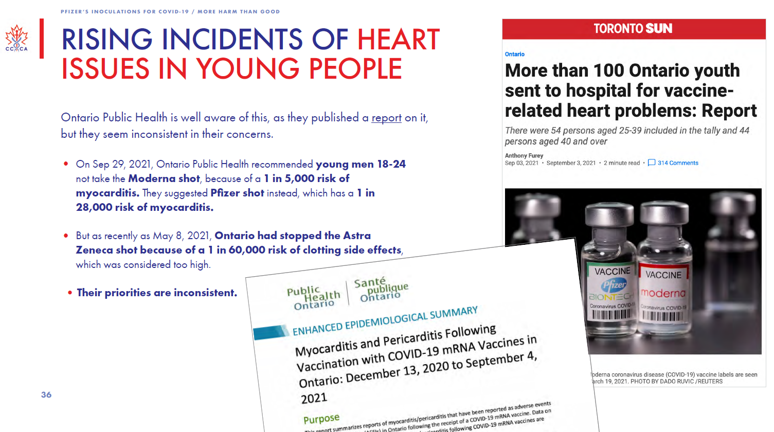 Anumite indicii au reusit sa iasa la lumina. Auzim din ce in ce mai mult despre cresterea numarului de tulburari cardiace la tineri. Departamentul de sanatate publica Ontario cunoaste foarte bine aceasta problema pentru ca a publicat un raport despre acest subiect. Par insa inconsecventi in ceea ce priveste ingrijorarea lor.