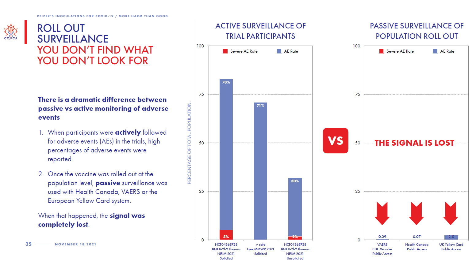 In tara noastra, guvernul asteapta ca doctorii intreprinzatori si persoanele particulare sa raporteze catre ei efectele adverse. Health Canada nu numai ca asteapta dar chiar ingreuneaza raportarea. Este foarte dificil sa raportezi in Canada o reactie adversa la inocularea covid (la fel și în România – n.n.)
