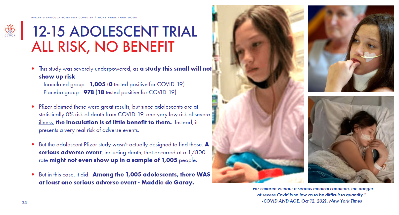 Pentru adolescenti, vaccinarea inseamna numai riscuri si nici un beneficiu. Studiul a fost sever subminat de faptul ca un studiu atat de redus nu a furnizat date de incredere privind efectele adverse. A existat un grup de 1005 adolescenti inoculati si nici unul dintre ei nu a fost testat pozitiv la covid 19, si un grup placebo cu 978 adolescenti, dintre care 18 au fost testati pozitiv pentru covid 19. Pfizer a pretins ca acestea sunt rezultate foarte bune. Dar din moment ce adolescentii au un risc statistic de 0% de a muri de covid 19 si un risc foarte mic de imbolnaviri severe – de fapt New York Times a publicat in octombrie 2021 ca pentru copiii cu probleme serioase de sanatate, pericolul imbolnavirii severe cu covid este atat de scazut, incat este dificil de cuantificat -, inocularea aduce foarte putine beneficii pentru ei dar prezinta un real risc de efecte adverse.
