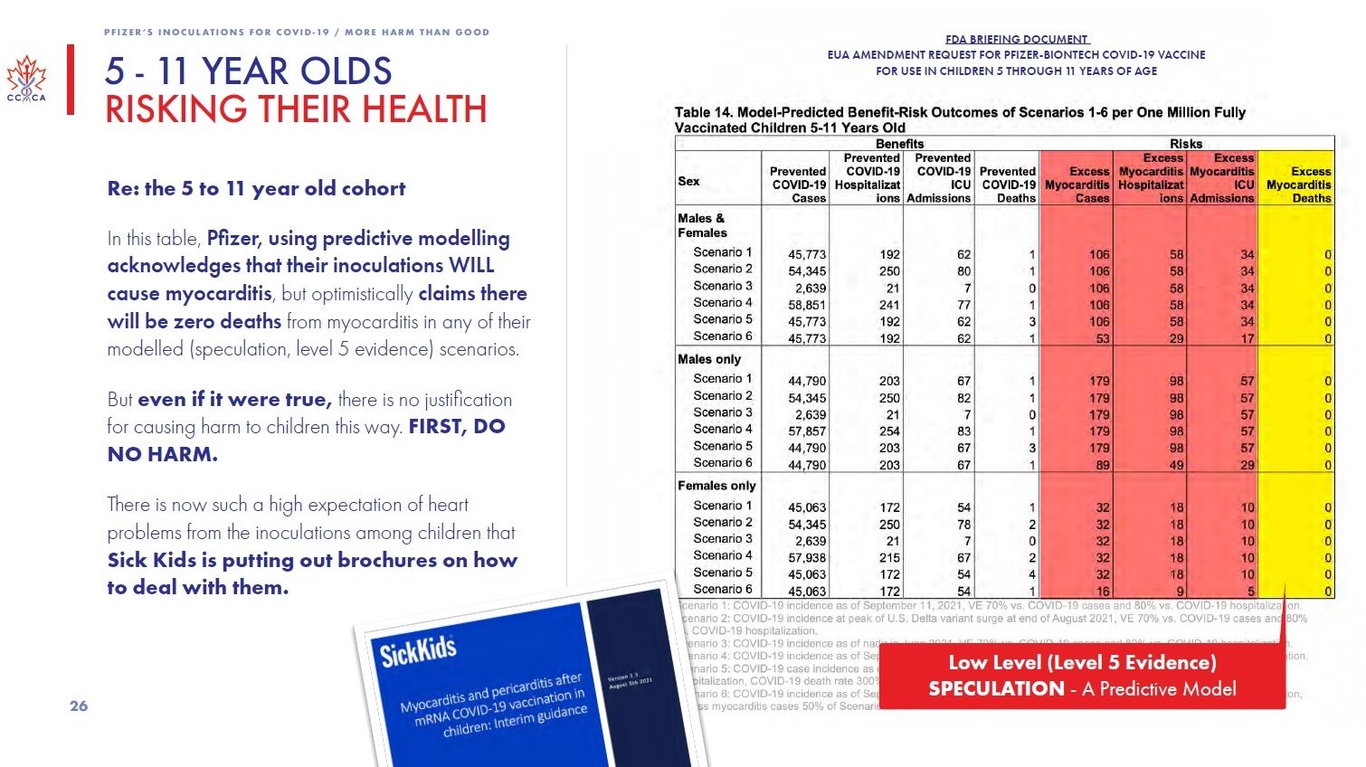 Chiar daca Pfizer ar putea sa aiba dreptate referitor la faptul ca inocularea nu produce imediat decese, sustinem ca probabilitatea de deces la un caz din cinci in urmatorii sase ani si jumatate, este fara putinta de tagada un risc de neacceptat pentru copii.