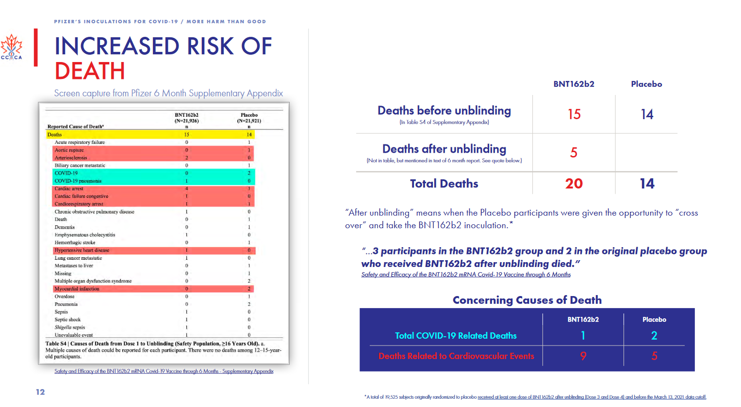 In schimb, numarul deceselor aici este usor mai ridicat, cu 50 decese in grupul inoculatilor fata de 40 in grupul placebo. Arata deja rau pentru inocularea Pfizer dar in realitate lucrurile s-au agravat in lunile de dupa dezvaluirea apartenentei, cand participantii placebo au inceput sa treaca in cealalta grupa si sa se vaccineze, deoarece au mai murit inca cinci oameni care erau inoculati.