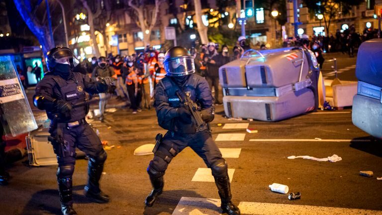 Sute de manifestanți s-au adunat din nou, vineri, în centrul Barcelonei. Tineri cu cagule au spart vitrinele magazinelor și au creat baricade din tomberoanele de gunoi. Polițiștii catalani au fost atacați cu sticle, pietre, artificii și vopsea. Și în capitala țării, Madrid, au avut loc ciocniri între protestatarii violenți și oamenii legii.