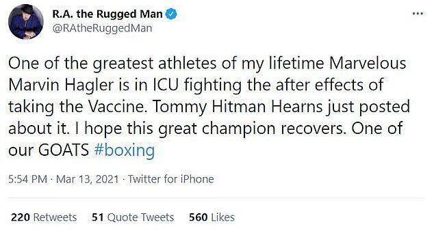 The Daily Mail sugerează că Thomas Hearns ar fi primit critici pentru că a menționat că prietenul său Hagler suferea după ce fusese injectat cu un vaccin experimental Covid. Ulterior, acesta a revenit cu o postare conciliantă, preluată și de The Daily Mail: