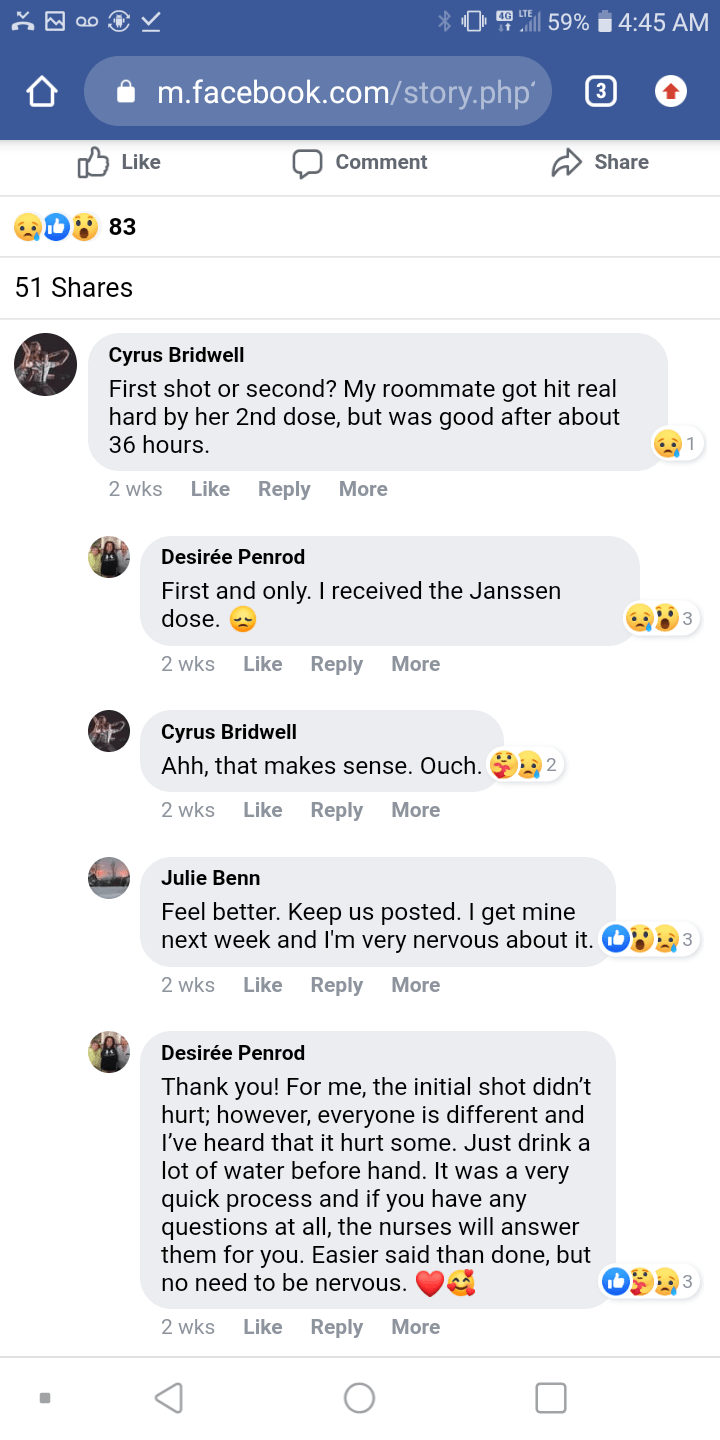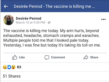 Desirée Penrod a scris pe Facebook că a primit „doza Janssen” pe data de 9 martie (sau în preajma acesteia). Janssen Pharmaceuticals este divizia farmaceutică a companiei Johnson & Johnson și a dezvoltat vaccinul pe bază de vector viral JNJ-78436735, administrat ca doză unică.