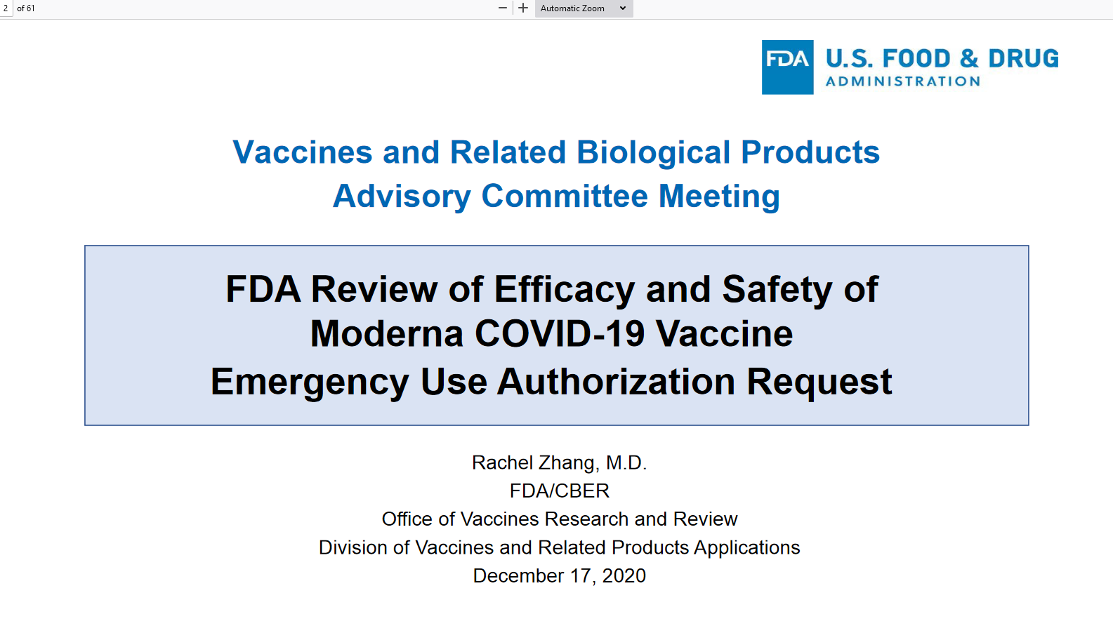 Vaccines and Related Biological Products Advisory Committee December 17, 2020 Meeting Presentation – FDA Review of Efficacy and Safety of Moderna COVID-19 Vaccine Emergency Use Authorization Request
