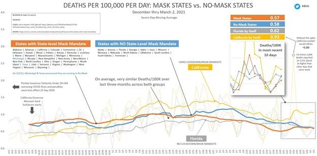 Regulile sunt mai stricte în statele de coastă, unde există mari zone metropolitane, deși unele zone precum Florida sau Carolina de Sud se abat de la această regulă. În practică, restricțiile sunt mai nuanțate, dar rezultatul este același: cu sau fără mască obligatorie, curbele de contaminare sunt asemănătoare.