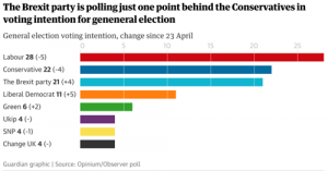 Anunţat în 20 ianuarie 2019, înscris în United Kingdom Electoral Commission în 5 februarie 2019, este astăzi, la 3 luni de la înscriere, pe primul loc în cursa pentrru alegerile europene după cum o arată graficul de mai jos: